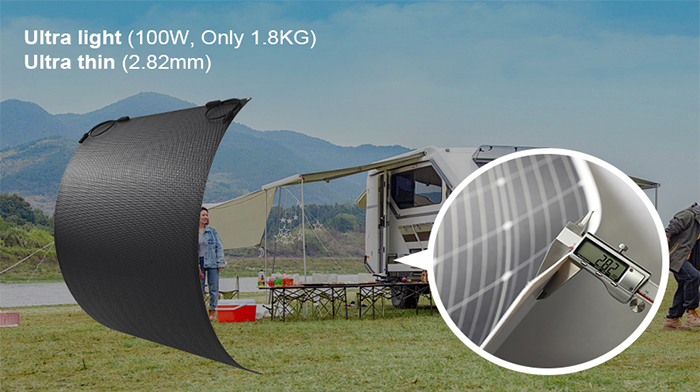 A flexible solar panel is a lightweight, bendable solar module made with thin-film or ultra-thin crystalline solar cells. Unlike traditional glass panels, flexible panels can be mounted on curved or uneven surfaces such as RV roofs, boats, tents, and curved metal roofs.